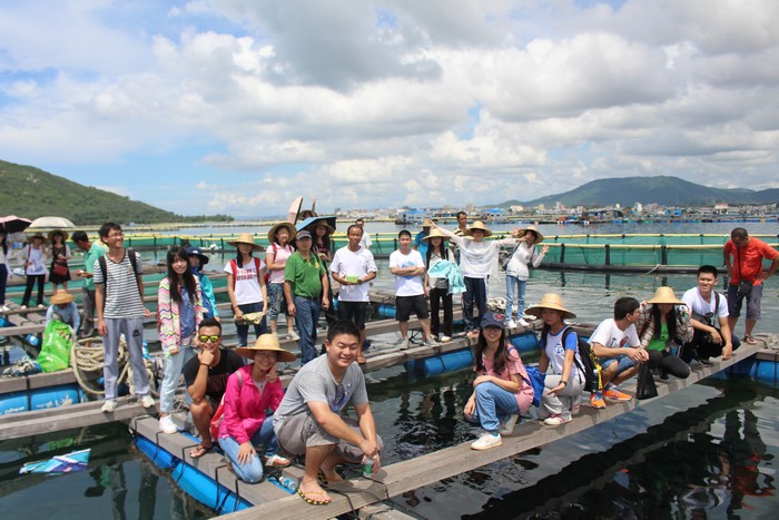 学生们在海南陵水万裕龙虾网箱养殖专业合作社参观学习
