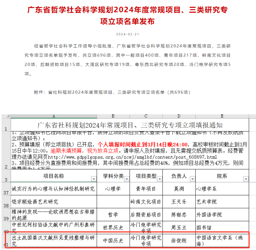 近日,广东省哲学社会科学工作领导小组公布了广东省哲学社会科学规划2024年度常规项目、三类研究专项立项名单,中文系(珠海)徐俊刚副研究员获广东省哲学社会科学规划2024年度冷门绝学项目资助。