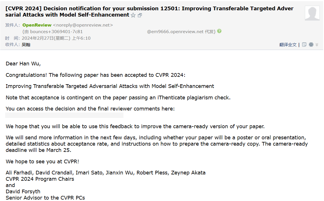 近日,软件工程学院2020级本科生吴翰、区冠彦以共同第一作者身份投稿的学术论文Improving Transferable Targeted Adversarial Attacks with Model Self-Enhancement被人工智能领域的国际顶级会议CVPR 2024接收。