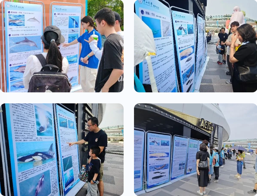 学院工作人员精心布置濒危鲸豚科普展览,并向浏览的市民进行讲解。市民们认识到海洋中各类鲸豚动物,提高海洋保护意识。通过观看展板图文和听取讲解介绍,同学们了解到濒危鲸豚的形态特征、生活习性和生存现状。