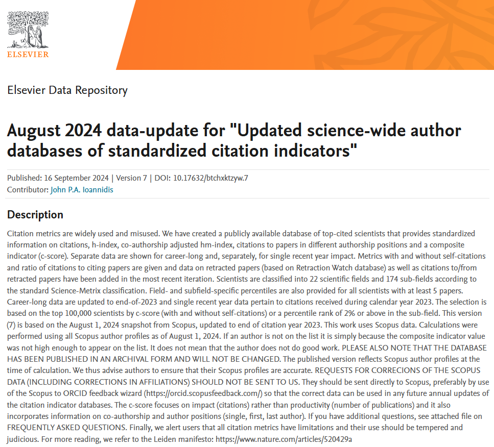 2024年9月16日,美国斯坦福大学(Stanford University)John P.A.Ioannidis教授团队发布了第七期全球前2%顶尖科学家榜单(World's Top 2% Scientists)。榜单分为“终身科学影响力排行榜”——关注整个学术生涯迄今的影响力,和“年度科学影响力排行榜”——聚焦本年度(2024年)的学术成就。