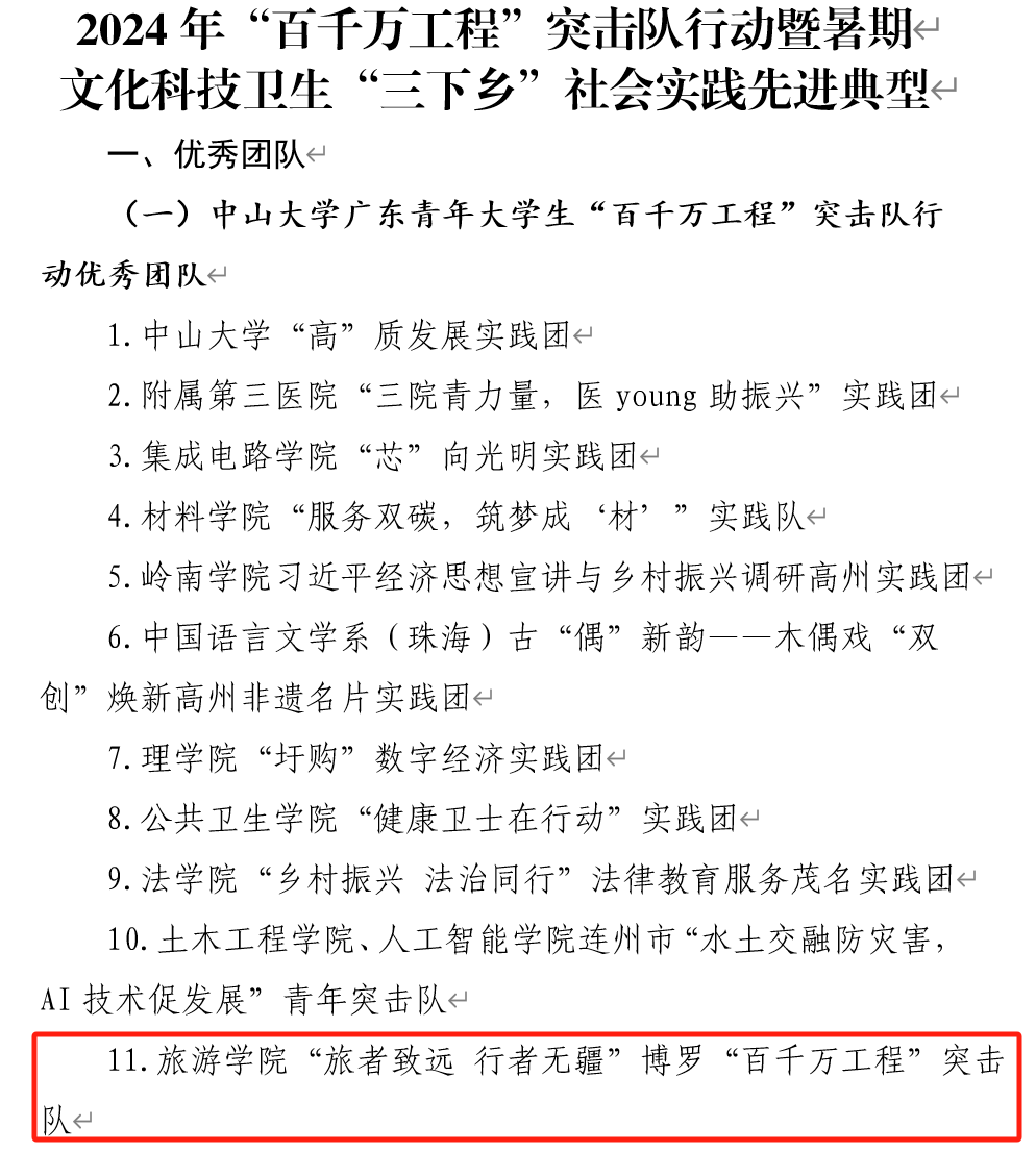 近日,在中山大学校团委组织的2024 年“百千万工程”突击队行动暨暑期文化科技卫生“三下乡”社会实践先进典型评选中,旅游学院荣获优秀组织单位,旅游学院团队“旅者致远 行者无疆”博罗“百千万工程”突击队荣获优秀团队,周明博士荣获优秀个人,团队还将代表学校,参加省级优秀团队等奖项的角逐。同时,博罗“百千万工程”突击队还在中山大学党委学生工作部组织的“小我融入大我,青春献给祖国”师生主题社会实践优秀案例评选中,斩获一等奖。这既是对旅游学院社会实践工作的肯定,更是对团队的鞭策,也将激励更多的年青学子投身乡村社会实践,青春报效祖国。