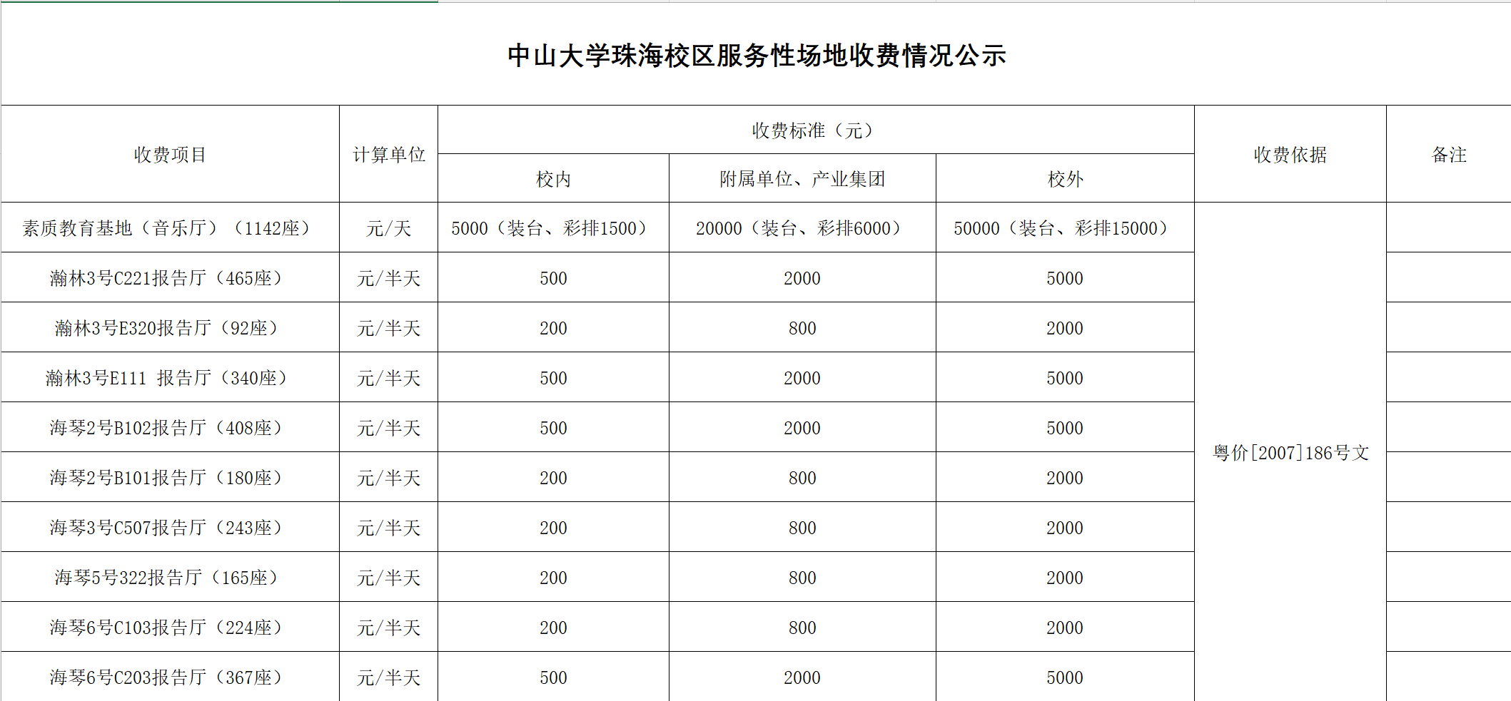中山大学珠海校区关于服务性场地收费情况公示的通知